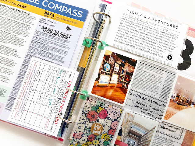 I snagged the welcome folder from Royal Caribbean and used that, plus the envelopes that I brought with me to store all the bits and bobs I collected throughout the trip. When I got home I simply cut it in half, punched holes and was able to add it to the album.